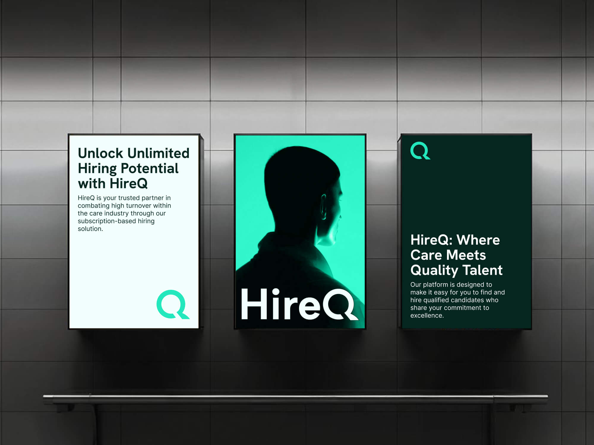 HireQ is a subscription-based hiring platform solving high turnover in the care industry with unlimited placements and flat fees. We built a sharp, scalable identity that feels structured, modern, and ready for growth. Every detail from the ‘Q’ symbol to the fresh mint colorway supports its promise: strategy-backed hiring, done right.