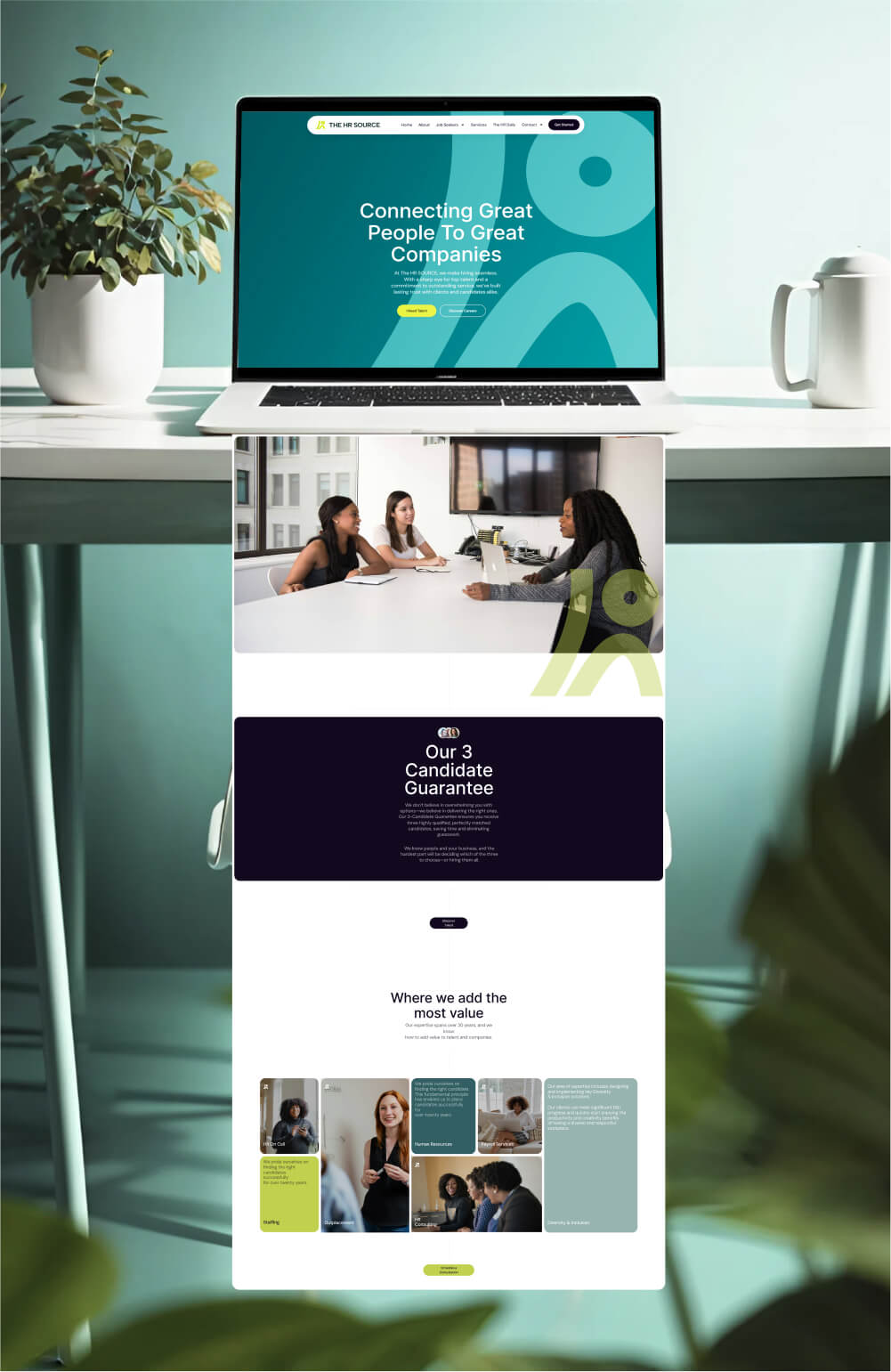 A thoughtful and people-powered brand identity for The HR Source, a company redefining what hiring should feel like, personalized, precise, and partnership-driven. With over 30 years of expertise, The HR Source connects top-tier talent with great companies through strategic hiring, tailored HR consulting, and a one-of-a-kind “Three Candidate Guarantee.”